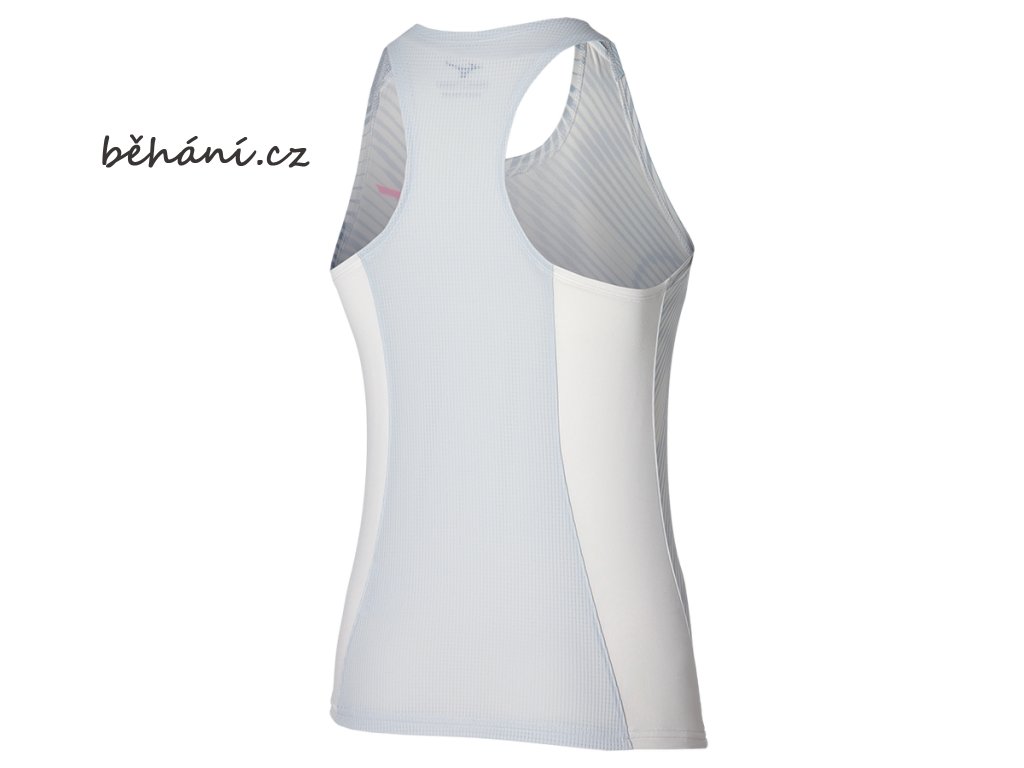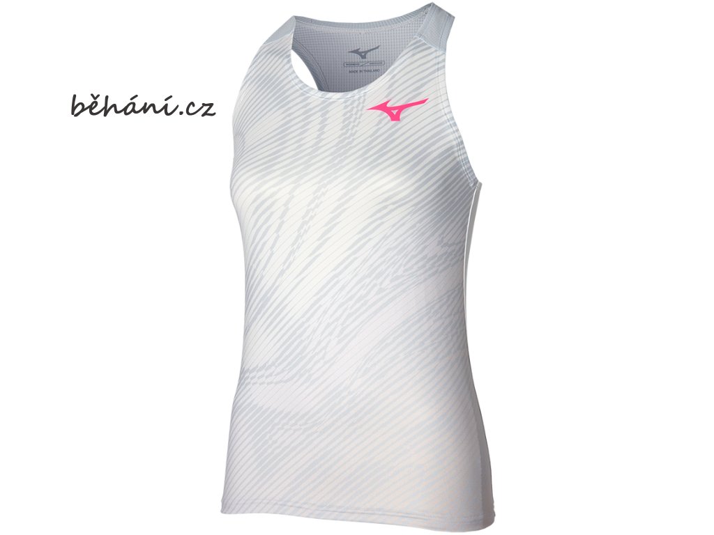 Dámské běžecké tílko Mizuno Charge Printed Tank 62GAB20201. „Racerback“ střih zadního dílu se vsadkou z prodyšného materiálu Dry AeroFlow umožňuje maximální volnost pohybu.